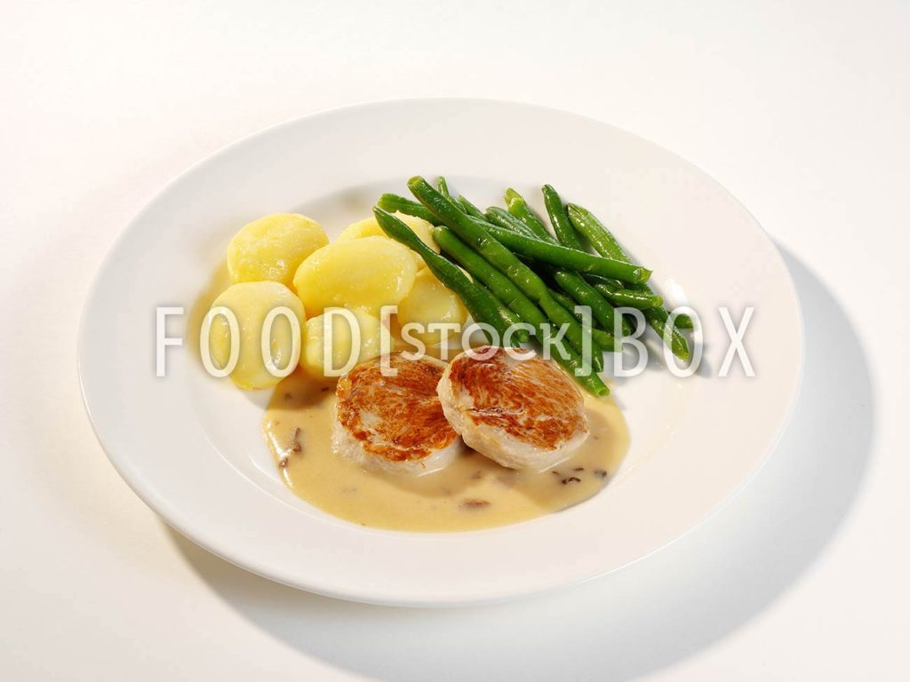 Schinkenmedallion an Kartoffeln und Böhnchen