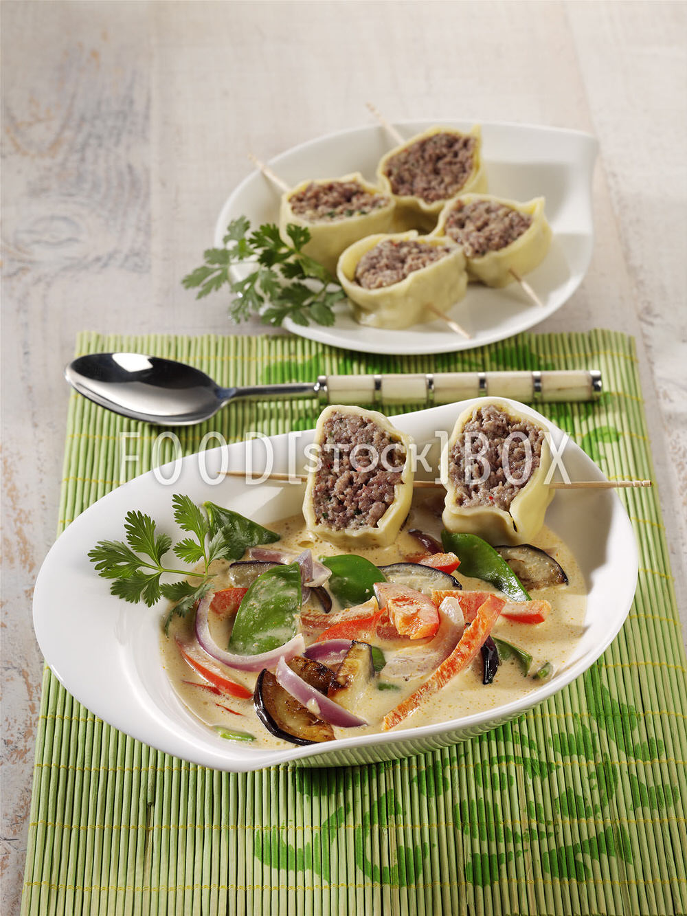 Gemüse-Kokos-Eintopf mit Nudel-Hack-Spießen
